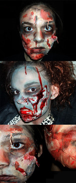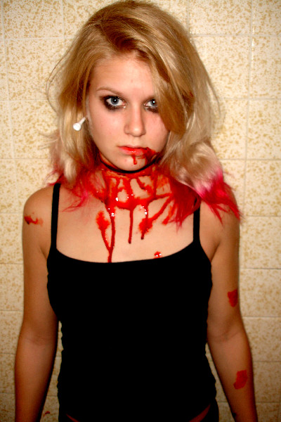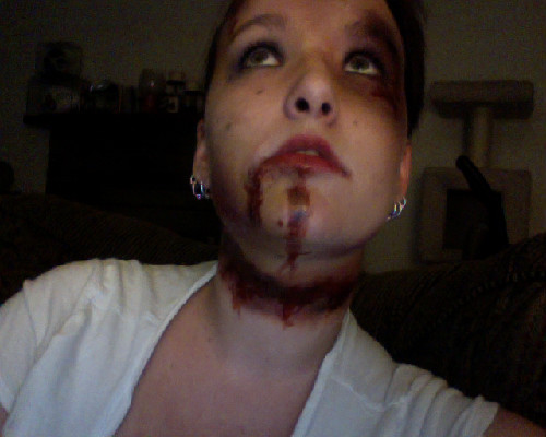 My makeup for Day 1 of the FanExpo. The wound looked a lot better when it was filled with blood, but it kept drying and cracking off....(you can tell by looking at the peeling drip mark on my chest!lol) I should have just used homemade fake blood because it stays gooey longer, but since I was working the Vamp Productions booth I didn't want to be dripping all over the merchandise!