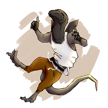 He is strong, can climb on trees easily. Morf is smarter than Rio, careful, calm, very brave. Rio may be anoying sometimes but Morf will always protect him, they are like brothers, friends, there's a strong bond between them. He has 5 big and strong teeth, each hand has 2 fingers and a thumb (all with with claws), each feet has only 2 toes. No tail, no nose, no eyes.. How Morf sees then? He may be able to see clear patches of light and shadow. Breathes through the jaw. Morf's ears are kinda under the skin but he can still hear everything. He isn't "blind", he knows very well what is where.. oh and he walks once on 2 legs, once on all 4.