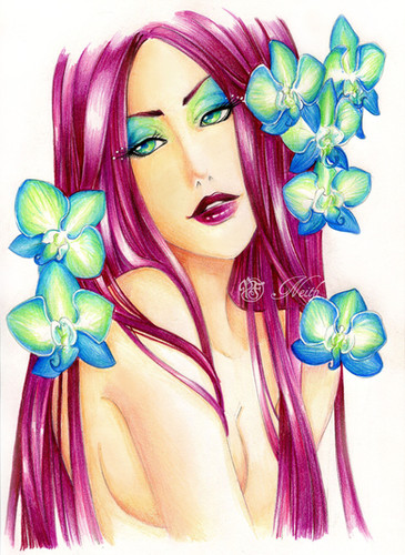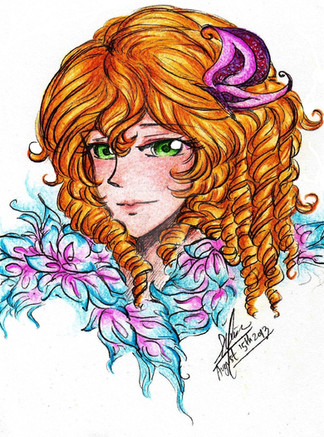 Well I really loved this art. The detail and the non anime nose. yay! >w< a step to improvements! The first season I drew. I wanted her to be all springy and lively. I really love the eye. I used water color *BREATHE* color pencil to color her orangy red eyes. >.< turned out so well too. Love the hair the most though. Its so detail. And i'm amazed at the sexy green lips. lol