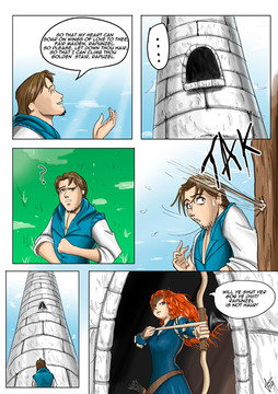 This is why chasing Vanessa and outing her for being a jerk would be useful so people like Quasi don't get a false idea about what's going on. Now I'm imagining her running by them and us readers screaming at her for deceiving the girls and Quasi getting distracted from over protective brother mode. Now on to the art. I absolutely love Repunzel's hair buns a la Sailor Moon! Everyone's clothes look great and I particularly like the details with Merida's hair.
