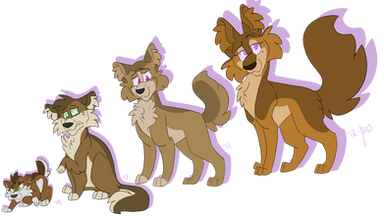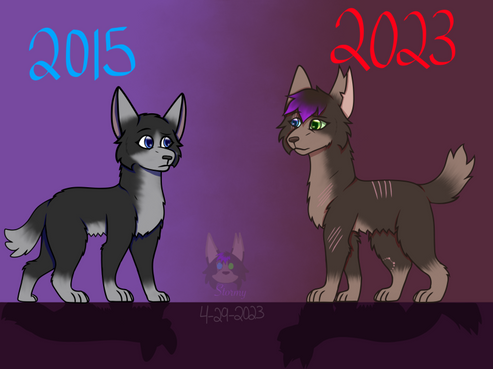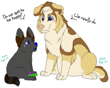The blue one is one of the ways I drew my old dog, Monkey, and I'm not sure who the brown dog is. My guess is a random dog or a fursona.Related content