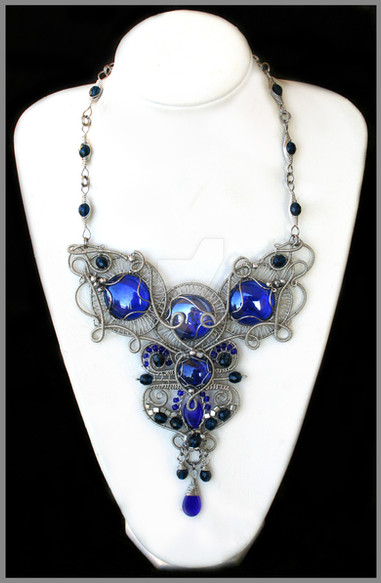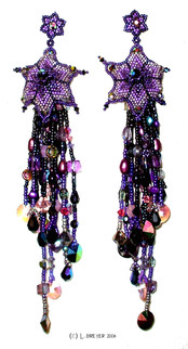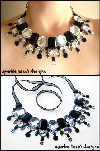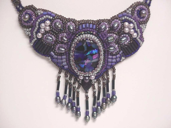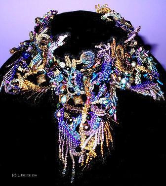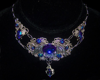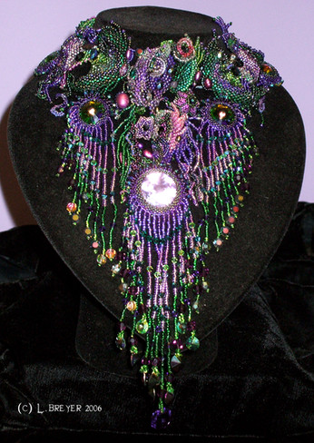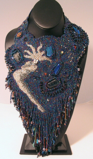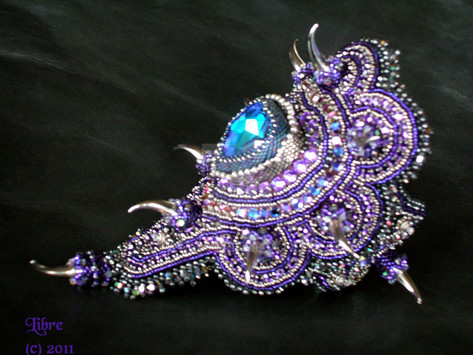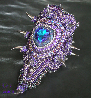 Mammoth project including, peyote stitch, wire work and bead embroidery.Materials are swarovski cabs, sterling silver, more swarovski and goth spikes.