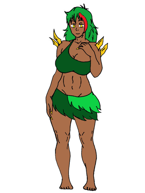 Through living in a tough environment, her body is sturdy and has plenty of stamina - to the point where her skin can barely be scratched by prolonged exposure to abrasive surfaces (Her feet for example, can handle walking on the jungle floor, often littered with fallen pointed branches). Her treehouse is as massive and solid as she is, sitting atop one of the tallest trees of the island, so she can overlook most of the jungle and the sandy shore, where most visitors end up. It has only a few rooms and amenities, as Mia tends to venture outside for certain things, such as tending to her boat, or taking a bath at her favourite waterfall, surrounded by very pretty (and very poisonous) flowers. Modesty is something Mia knows, yet the waterfall allows her to be much more free, bathing and drying off in the nude.