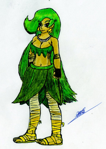 Chalk it up to my amazon (And dark skin, and huge feet) fetish for Mia's existence! I wanted to remake her original clothes, make them look more... well, hand-made. It looks like it may fall apart, though! Heh, it really reminds me of the older-older version of Mia (See 'A Bit of History - Mia' for what I'm talking about!) Only those things (and the type of her eyes) have mainly been changed. Oh, and she's a little taller than before (an even 10 feet compared to the original 8'7''. Quite a growth spurt!!)