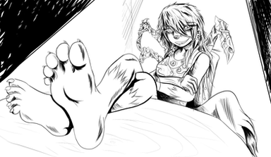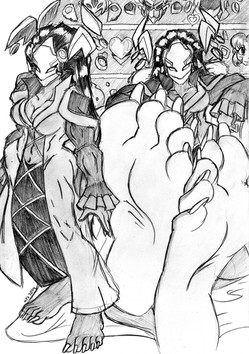 How did this happen? Tristan actually did a prank call and Taikitsu just showed up at Kit's house as a call-in. (Her human form is a call-in stripper) Though, she's free to show her actual form, and my dear friend simply cannot resist a pair of huge beautiful feet.