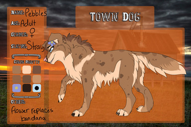 Description: Lilac is a simple Cattle dog with unusually long face/neck fur and a rather long haired tail. She has folded ears, and her right ear is torn. She has a bird marking on the right left side of her flank and the rest is normal. Lilac also has 2 flesh wounds. 1 on her tail from a Bite Roamer gave her, and the other a gash on her leg to which exposes bone. Her eyes are a light sky blue, but rather bloodshot from side effects of said Infection.