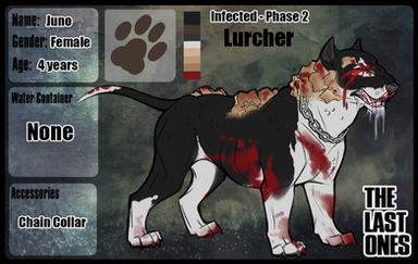 Background: Lilac was born in an alley, in the spring- she had 4 siblings and to which some owners of a restaurant found the litter and took them in, to care for Lilac and her family alone in a nice home. After many months her siblings had all been adopted leaving Lilac herself and her mother- who shortly died of heart worms. Lilac grew up into a fine loyal dog, when she had met the stray Roamer along the street one night. She'd known him for about 6 months before she found out she was expecting a litter of pups. After they were born Roamer came to the home with bandanas he'd found in a trashcan down the road for the pups- tho it didn't take long before the infection spread and Roamer too was a victim of it. Roamer had killed Gabe and Phoebe while Lilac was out on a walk with her owners but as she got home she raced to Tucker before Roamer had the chance. She'd attacked and killed him all in about 15 minutes, then discovered too she'd been bitten. Lilac ran away in hope to protect Tucker from her disease. Shortly after she'd stumbled upon the group for infected dogs like her- there she could feel safe and not worry about hurting someone that had a life to live away from sickness.