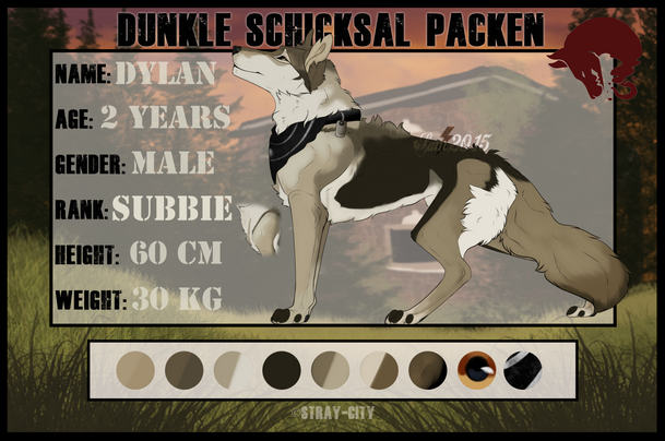 Description: Tucker is a multi-colored pup resembling an Australian Cattle dog. His right ear folds at the corner, whereas his other is perfectly perked up. He often finds himself stumbling over his rather large paws and has fluffy face, and neck fur. The rest of his fur is medium-to little in length. His nose is liver, but the right half of it is darker than the other. He has a teal bandana given to him as a pup from his Dad before the infection spread. He doesn't go anywhere without it. His left eye is Blue, while his right eye is brown.