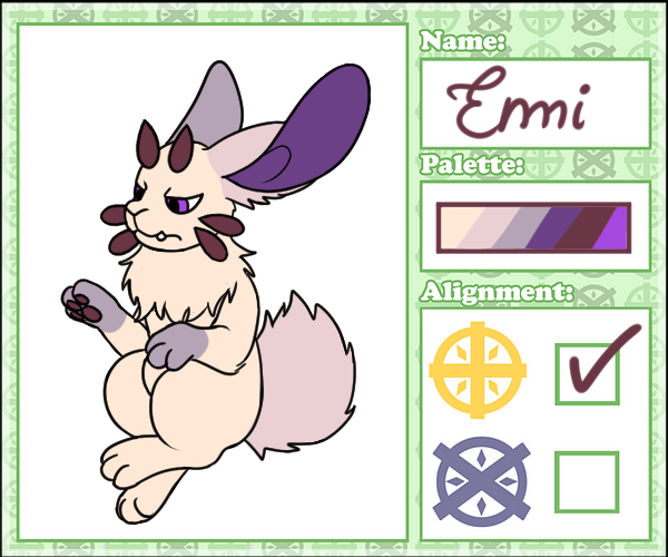 Enid was originally brought to the Nook as an egg almost immediately after she was laid. An older couple living nearby Wynsiph was entranced by the speckled purple egg and adopted her. After she hatched, however, her tendency to kick everything resulted in her being brought back to the Nook, but she didn't really care. She couldn't be bothered to care. There are several dents in the walls in her room.