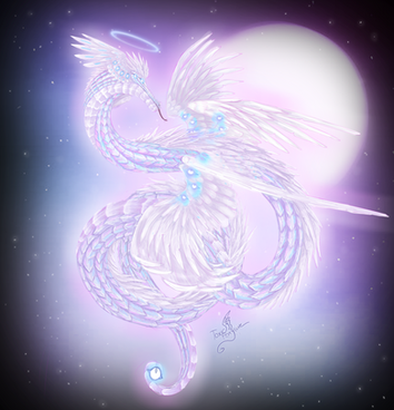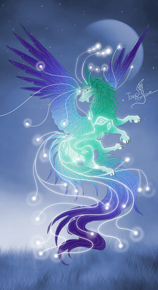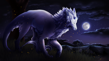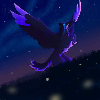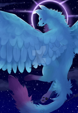 A completed commission for nimsilver who requested a white winged fox with stars and moon in the background for a phone wallpaper.