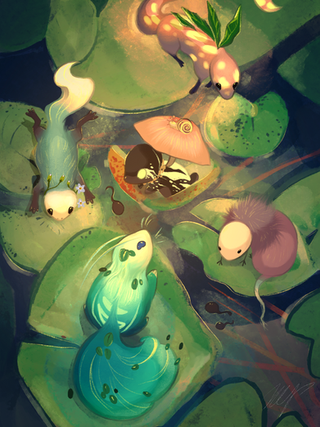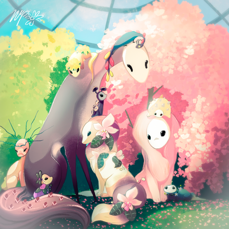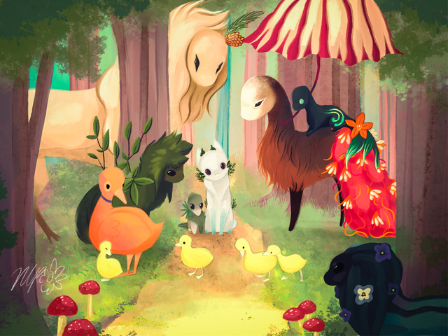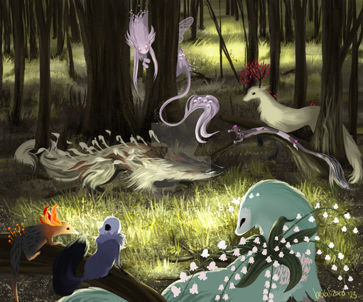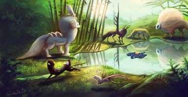 It's been almost 3 years! Designs have changed, so has the environment. In the original I created a stark contrast of plant communities right against each other. I wasn't super experienced with painting backgrounds yet (if I even am now) and I didn't fully grasp how realistic the esk world is supposed to be. Upon redoing it I tried to create a more natural flow as though the oak and bamboo forests are growing into one another and the stream is a threshold. I also like that it almost looks like the same spot that has become overgrown as the years went by