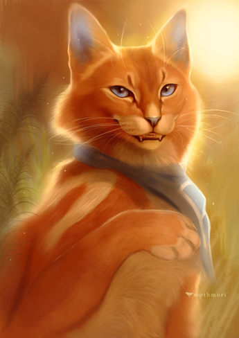 The crowd had parted so that Leafpaw could make out the young cat crouched beside him. [Mothwing] was startlingly beautiful, with glowing amber eyes in a triangular face, and a long golden pelt with rippling tabby stripes.