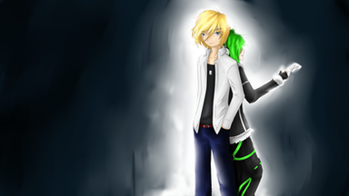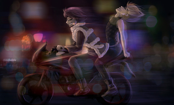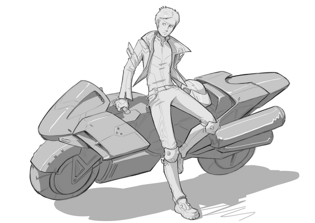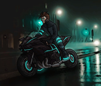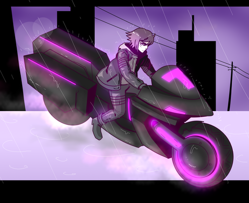 Totally love the way you did this bike! The glow of where everything is really makes it pop and the way his RRB outfit is glowing to just makes him look very cool. I love the background too it very rundown and looks like chalk, but it gives the picture so much life it just draws my eyes to it. Great work on this!