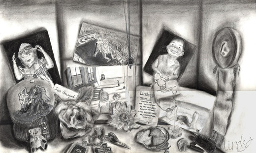 For my Drawing II class. Not my best but I'm still happy with it. Featuring my Dan and Sydney bobbleheads, Periwinkle the Piggy Bank, and PikachuCharcoal, 3 hours, 18" x 24"