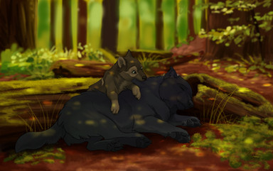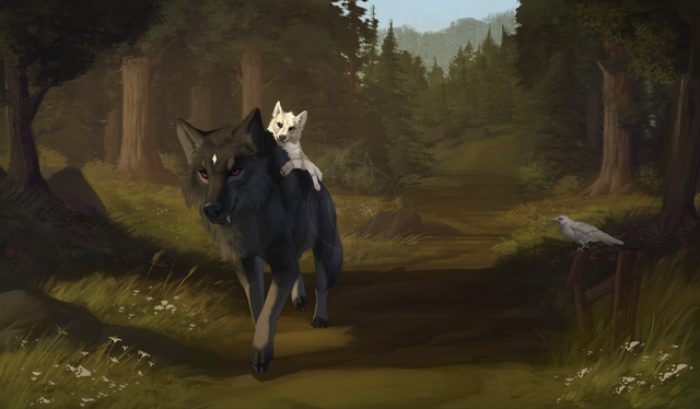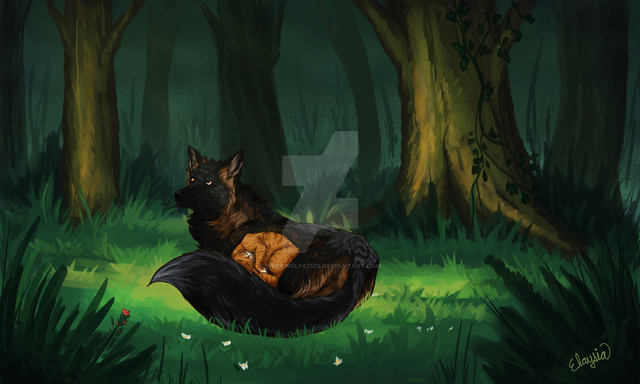 This is such a cute and beautiful piece. I first appreciated the wolf and kitten, but the more I looked at the background and the effect, it is just really beautiful--any plans for prints?