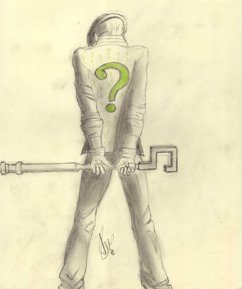 Anyway, this was my take on The Riddler, aka Edward Nygma (E. Nygma, lol). Before drawing him, I first read the Wikipedia article on him, just to get a good idea of who he is, what his backstory is, and what he does. Based on what I read (and also what is common knowledge to everyone, even if you don't read the comics) it seems to me that if The Riddler existed (or was in one of Nolan's films) he'd resemble the Zodiac Killer in the way that he'd send letters to police or the press that he wrote that would be seemingly mindless riddles that would need to be solved and deciphered, except, of course, the letters would involve other crimes other than murders, and he wouldn't be a serial killer, either. His crimes would involve the usual ones seen in Batman, such as robberies, kidnappings, ect. I could see him as being slightly more sane than the Joker and more suave with his manners, but not afraid to get his hands dirty. Where the Joker's trademark in TDK was slicing and painting his victim's faces and leaving Joker cards at the site, the Riddler would leave letters, notes, maybe even writings on walls, all riddles, and of course, his trademark symbol would be the question mark.