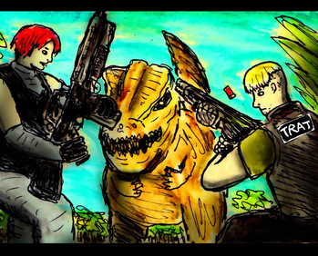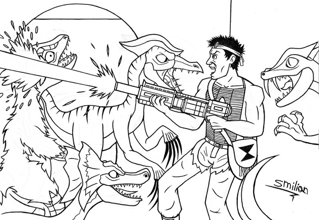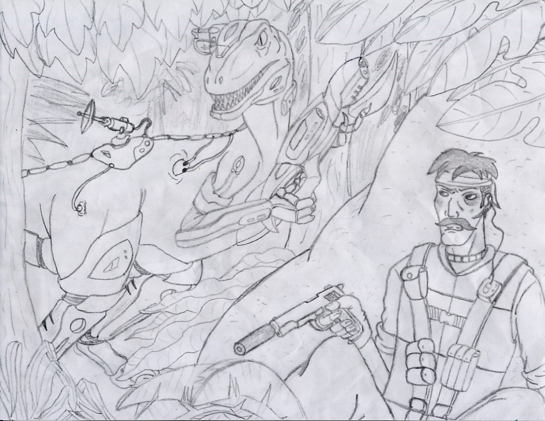 A pic I made for DINO EATER ( [link] ), a story made for the OZComix! universe ( [link] ) in OmniverseZero world building community ( [link] ). The universe is a joint, multi-member venture wherein we make characters and organizations and stories set in an original comic-book-style universe. The story itself is a sort of homage to Metal Gear Solid 3 and Jurassic Park staring Fidel Castro--Cuba's one (and only) hard core special ops operative who happens to be named after the Cuban leader--and the Dinosaur Uprising, a Jurassic Park-style venture gone awry led by psychic pterosaurs hell bent on world domniation. Crazy, i know, but hella fun.If you wanna know more, click on the links I provided.
