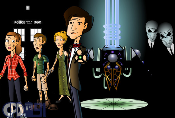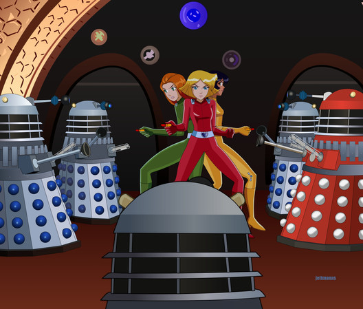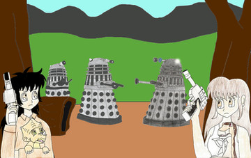 The background I created on PhotoShop and PhotoStudio. It's supposed to by a gym dressed up for a sci-fi theme party or con or some such. The "control room" backdrop was based on a an actual set design I found on Google, the Stargate was taken from a Google search and modified on my image programs, the poster on the wall is also a bit of clip art I found on Google. The star backdrop on the stage is a piece of the Deep Field image from the Hubble space telescope. The Classic Series Dalek Supreme is just a coloration of that old Dalek sketch somewhere in my gallery. I dunno if it's supposed to be a costume here or just a prop. you decide.