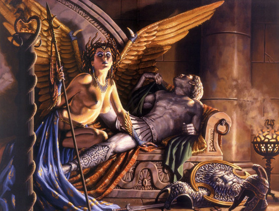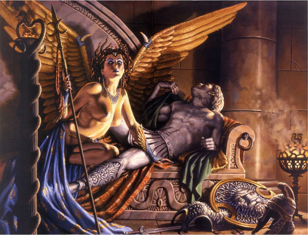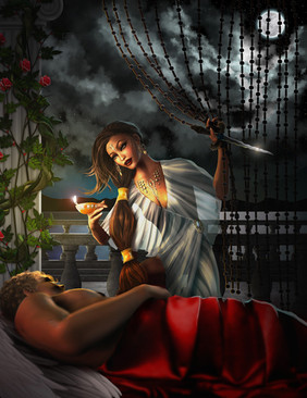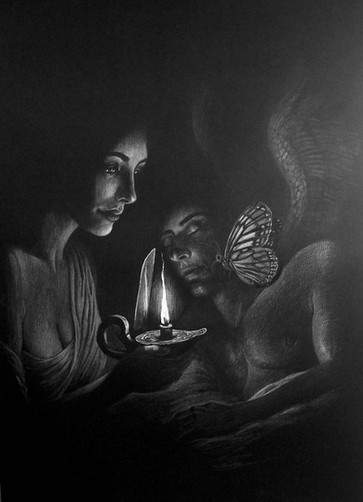 From the mythological story. This is the scene where Psyche sneaks in with a lighted lamp to steal a glimpse of her (previously unseen - he only appeared to her in darkness) husband. By seeing him, she loses him.This was a pen and ink commission that I had so much fun working on, and liked so much that I decided to color it on the computer. I "cheated" to get my color palette, in that I downloaded a few Rembrandt paintings, and sampled a range of colors from them to get the lamplit, subdued coloring that I wanted for this one.