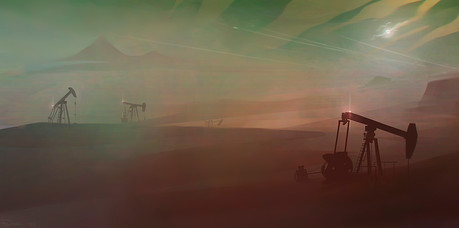 Awesome view, it's an stunning piece, some space, some desert planet... I'm wondering... this planet have life forms?... and the terrain-sky orange-blue contrast its cool.