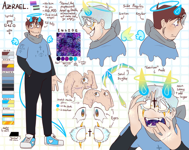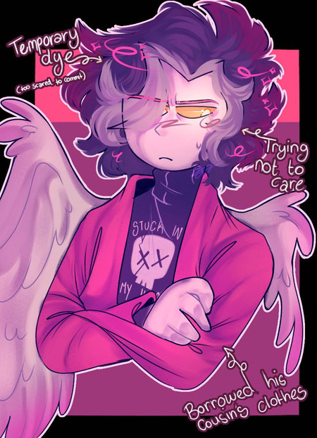 Unnamed is an incubus that was born from a suicide pact ritual that he, as a human, committed with his girlfriend Nameless as a means to escape humanity. Back when they were both alive, they were serial killers in the late 80s/90s. Unnamed was albino, hence his light colourisation as a demon, and Nameless was Philippine and transgender. He may look like an e-boy but he is in fact a horrible person, with an existential grumpy attitude, shallow minded opinions, and somewhat of a god complex! Deep down he loves his girlfriend and cares about his family, but his hatred of humanity and people as a whole often stops him from ever expressing it correctly