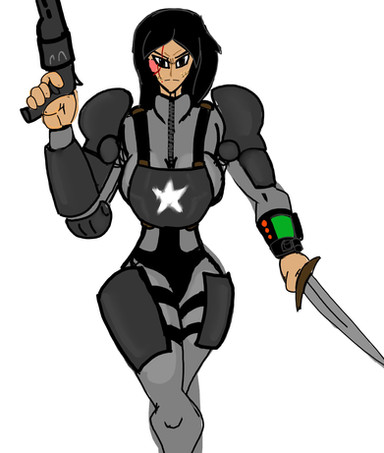 I like how this one came out...I'm not particularly caring for her hairstyle right here, but it's not horrible. I'm still trying to decide if I'm gonna give her short hair like she has here [link] keep it mid length like it is here, or make it between short and mid length like it is here [link] Or, being that she is a cyborg, I thought about her having different head covers/wigs as her hair. I'll figure something out. I'm loving the silver halo effect...it gives the illusion of her armor being shiny, and with the black it makes her look a bit more mechanical and menacing IMO. And of course I'm loving the lens flare on her eye! Maybe I should've added more detail to her gun...oh well.