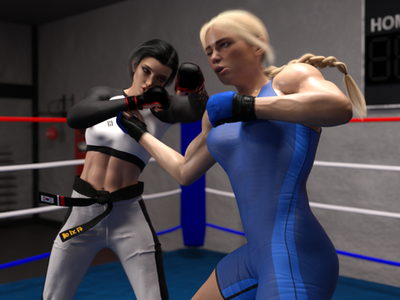 Here's Darkloner's flagship OC, the sensational Brazilian blonde bombshell Cici (in the blue gi and not to be confused with Darkloner's blonde superheroine OC named Bombshell) sparring with a new OC...fellow countrywoman Macy Silva (the brunette in the white gi), a black belt Brazilian Jui-Jitsu (BJJ) practitioner based on real-life Ultimate Fighting Championship mixed martial artist and world-class BJJ practitioner Mackenzie Dern.