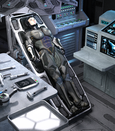 Here's a render that I prepared months ago, but for some reason didn't actually render until recently. I didn't exactly know where I was going with this one...she's either waking up after being turned into a cyborg, or she's captured and her captors are about to dismantle her.