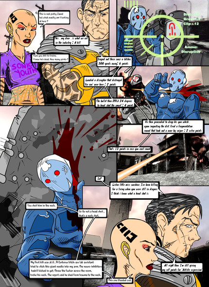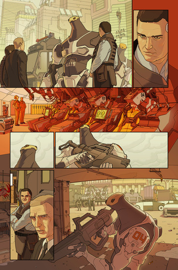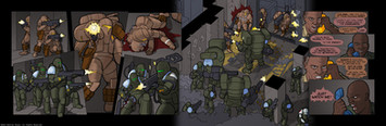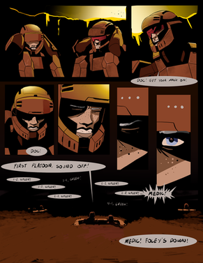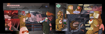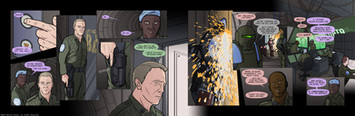 The next two pages of my comic 6-Commando [link] .I think this one was pretty successful. Chapter Two narrowed the story focus to the two primary human characters, and this marks the reintroduction of Mike-One-Echo, the third main character, the intelligent tank who's gone nuts and started a world war.
