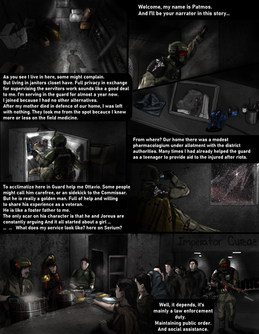 The emotions, the facial expressions and oh the frustration of not being able to understand a word of what they're saying! I find it authentic because it just adds to the flavor of the style and your universe, the urgency of the situation and the feeling of being alienated in a company of foreign-speaking soldiers. Like in the real world, I find myself looking back and forth between the conversationalists, half-expecting them to explain to me what they're saying!