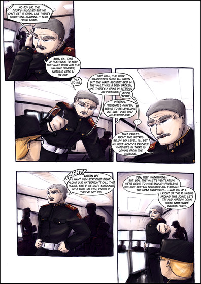 I took rather a bit of heat from the readers for leaving this set of pages in the original Russian, but my colleague in Moscow went to such lengths to write a nice bit of Russian script for the Federate soldiers here, that I felt it was unkind to him to start translating it back into English. My take, of course, is that you don't really NEED to know Russian to get the gist of the scene, and a huge part of the story is about what the "good guys" do and don't know about their enemy, and vice versa. As a result, when it's important that the reader know what's "really" going on, it's in English (for example, notice that the Russians dream in English? Yes...) Here, I just wanted to convey a message that "The Federates are crammed in a bomb shelter, and they're taking it very seriously." But for Russian readers, there's the added bonus that they ARE actually speaking real dialogue here.So anyway, I had one reader declare that he would never read my comic so long as I had untranslated Russian in it, and that I could "try again" when I was "ready" to use English. Well, okay. But personally, I prefer it like this. After all, watch the movie A Bridge Too Far - do you really "miss out" when the scenes with the Germans come up? Not really. And in real life, there are no subtitles. It took a leap of faith for the readers to get on board with this, I admit, but the vast majority supported me, I'm happy to say.