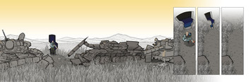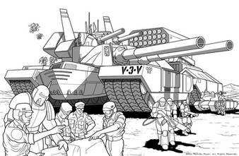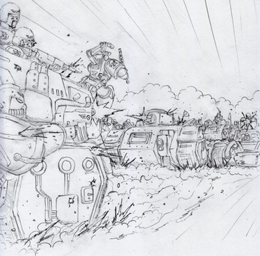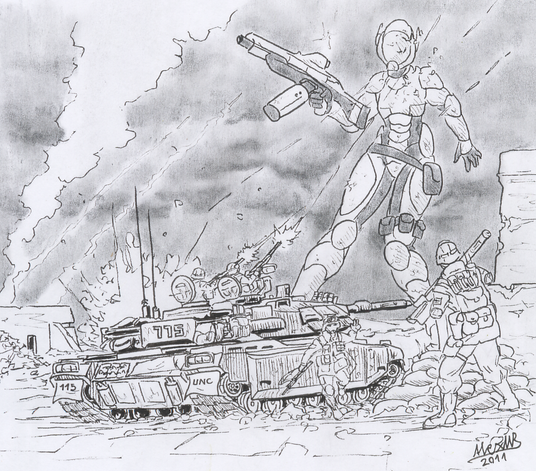 So Steve Jackson Games put up a contest for Ogre illustrations, the only restriction being that it had to show combat in the Ogre universe. Normally I don't enter contests, but this was an exception - I tossed this together over the weekend. Originally it was going to be in color, but I went with a greyscale instead, mainly because I ran out of time (the contest ended today and I had to go to work anyway).In this we see a Paneuropean Fencer cybertank taking one for the team, ramming a much larger Combine Ogre Mk. V to give his comrades time to escape. The laser tower is just there because for whatever reason I like laser towers. This was fun to draw, though I fear that for those not fully versed in Ogre it might look confusing. Either way, I gave it a throw!