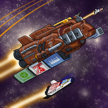 My comic attracts a rather tight-knit group of people, mainly from the U.S., Germany and Russia (about 500 or so in total, I think, among the regulars), and they all have very strong opinions when it comes to my engineering designs. This one, a robotic missile submarine, was rather harshly panned by one of the regulars, as looking too much like a spaceship, and being totally impractical as an actual submarine.Well, fine. But I still like it. It has a very sleek, tough look to it. And all those missile tubes... well, what can I say? I build houses, not submarines. It looked pretty good to me!