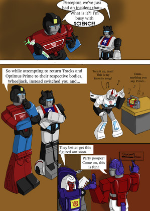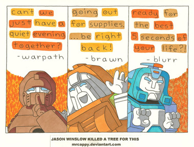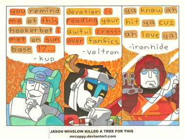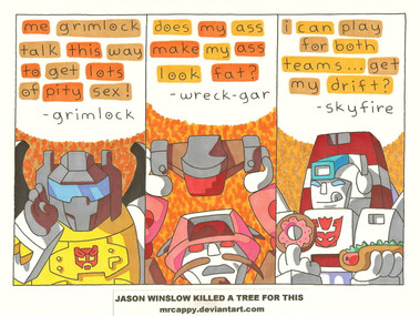 UPDATE: Hey transfans! Do you like my Transformer humor, but can’t understand why I taint the rest of my gallery with filthy hyooman characters? I’ve opened up a NEW gallery that’s one-hundred percent robot rousings. Transformer jokes will still be uploaded to this gallery as well, so if you like my general jokes then there’s no reason to watch the other site. So if you’d like to follow along Optimus and gang thru transfunny misadventures, head on over to Cappitron![link]