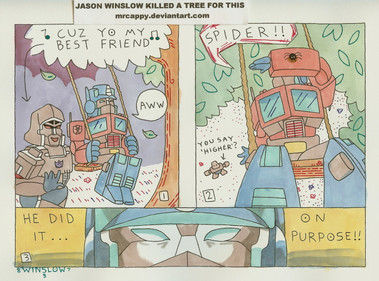 UPDATE: Hey transfans! Do you like my Transformer humor, but can’t understand why I taint the rest of my gallery with filthy hyooman characters? I’ve opened up a NEW gallery that’s one-hundred percent robot rousings. Transformer jokes will still be uploaded to this gallery as well, so if you like my general jokes then there’s no reason to watch the other site. So if you’d like to follow along Optimus and gang thru transfunny misadventures, head on over to Cappitron!cappitron.deviantart.com