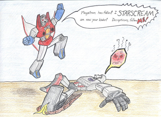 As soon as I wrote the words ‘this’ll be my last Transformers fanart’, I was visited by the Hypocrite Fairy, and he said “Hello Jason/Tard! It shows flexibility to recant a statement you made/You’re a putz and no one will ever love a flakey leaf like you. I’ll grant you more inspiration/I’ll make your soul a never-resting cloud of uncertainty!”