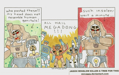 UPDATE: Hey transfans! Do you like my Transformer humor, but can’t understand why I taint the rest of my gallery with filthy hyooman characters? I’ve opened up a NEW gallery that’s one-hundred percent robot rousings. Transformer jokes will still be uploaded to this gallery as well, so if you like my general jokes then there’s no reason to watch the other site. So if you’d like to follow along Optimus and gang thru transfunny misadventures, head on over to Cappitron![link]