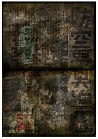 I like the new arrangement style. The pieces of tape along the top are great touches, as are the texture of the book. The bar code and text on the bottom piece could be overlayed more into the texture (they're floating a little)...and for some reason the absolute black and the sharp edges of text on the top seem really contrasting to the curves and faded black of the bottom. I think the funeral piece you did tied together a little better, but still very well done!