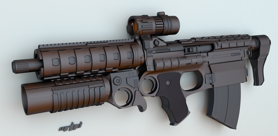 The model looks really good, but i have to agree with *crazyforthedesert, the scope won't be of much use there. You could just attach it to the pull-mechanic at the back