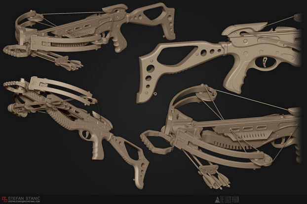 Hello. This thing might actually work out. Mechanic in the back pulls the bowstring with the slide, the slide pulls an arrow out of the magazine, shoot...simple and fast reload system.Blender/cycles
