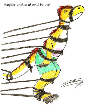 Yes, one must keep this vicious carnivore chained and restrained, because you never know what they might do! Of course certain raptors actually might like to be restricted and bound.Here is my little tribute and gift art for a very nice (flesh ripping carnivore) none other than restrainedraptor [link] himself.