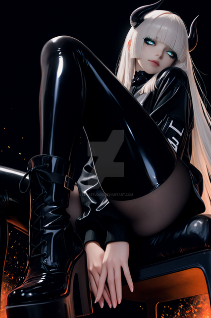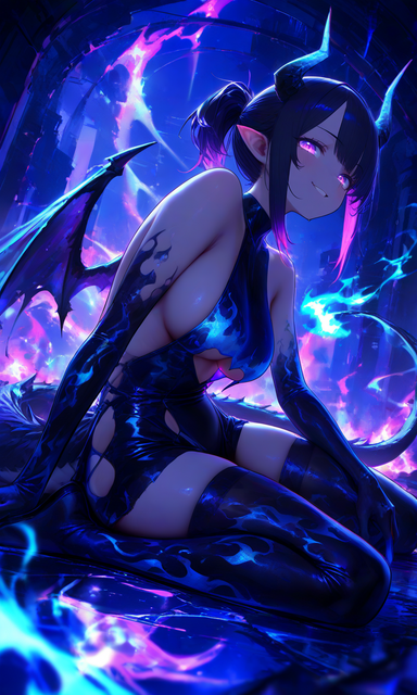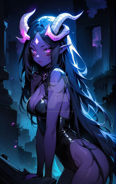#anime #animedrawing #characterdesign #darkfantasy #darkskin #demongirl #glowing #goldeyes #horns #illustration #illustrationart #magiccircle #monstergirl #oni #onigirl #purpleskin #succubus #succubusgirl #tattoos #whitehair #yelloweyes #waifu #aiart #hornsgirl #bunnygown