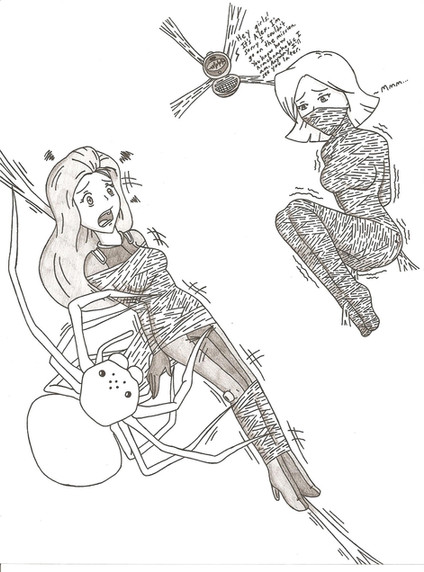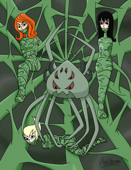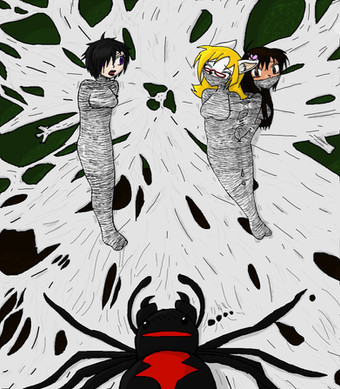 The spider woman is Alicia, 's OC. As you can see, she has wrapped up Urblake and Jennifer while Rebecca is also being held by the webs. She will soon be cocooned just like Urblake and Jennifer. This is based on a story me and are working on.