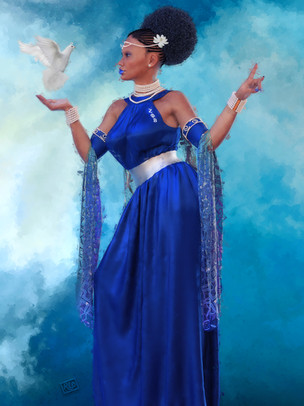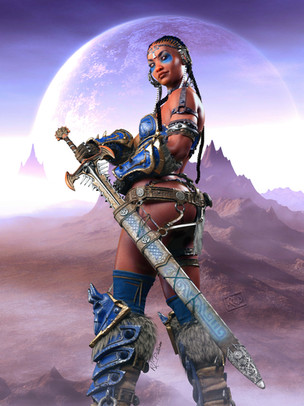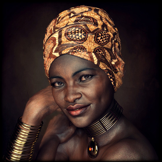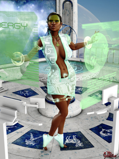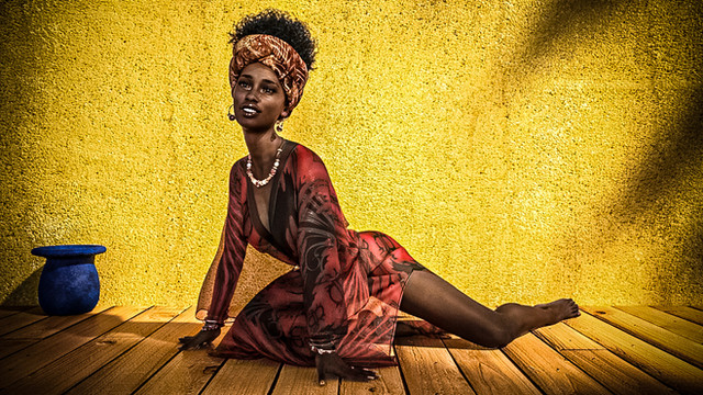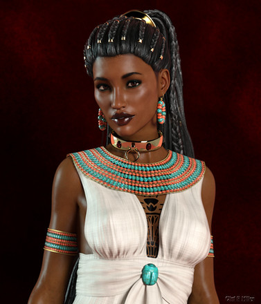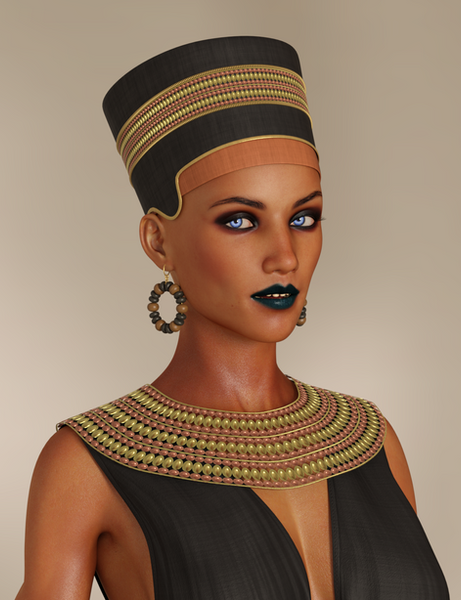 Really striking use of colors. Combined with the hair wrap, it gives that outfit an entirely new look than I've seen it have before. Nice skin tone. I think the shoulder could use some work (to fix the crease and anatomical problems), as could the eyes (to make them more life-like). The lighting is strong and interesting. I love your choice of jewelry. I think it would have been good to cite the items you used, but that's a minor point.