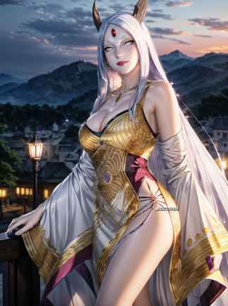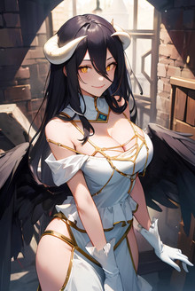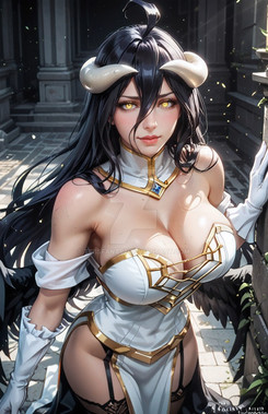 #bigbreasts #blackhairedgirl #bridaldress #bride #cleavage #digitalart #fanart #fantasy #hourglassfigure #didgitalart #aiart #looking_at_viewer #albedo #horns #kneeling #lingerie #stockings #albedooverlord #albedofanart #albedosexy