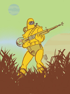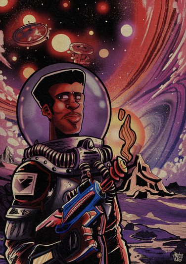 Beautifully amazing! This takes me back when I used to order books of Calvin & Hobbes back when I was in Elementry school. I absolutely adore the various planets and stars blended in the skies. The look of Spaceman Spiff all grown up and all heroic looking...