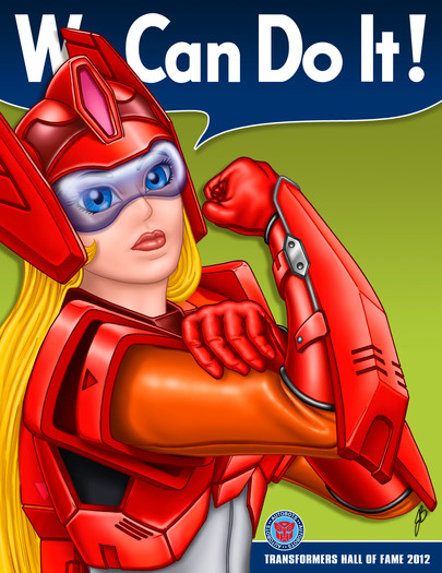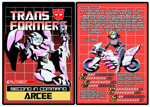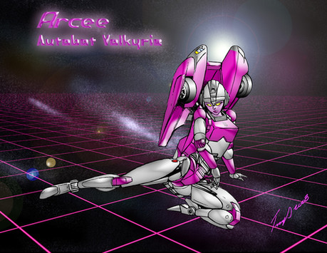 Yeah, it's a lousy pun. For those who don't know, yes, that's "the" Arcee of G1, in the spider-form she got as a BotCon 2001 convention exclusive. And she briefly had a Valkyrie-like death-foretelling ability that was quickly ignored as the convention's "Wreckers" fiction went on.Mind, this one did show up in the one issue of the TF Fan Club magazine, but as submitted fan-art, so I don't wanna go claiming it as official.