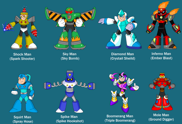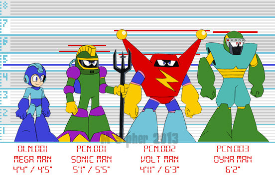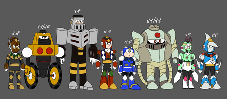 The rest are, again as per usual, “feels right” guesses. I considered making Snake Man really tall, but then figured that keeping him on the shorter end would be better, since he was designed specifically to navigate small cramped spaces.