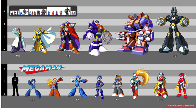 Back at it! Scale chart for the Robot Masters of Mega Man 3. Heights according to “top of the skull” and “full figure” respectively, where appropriate.