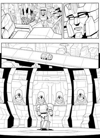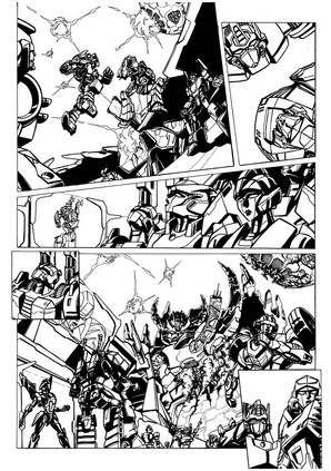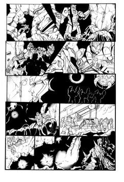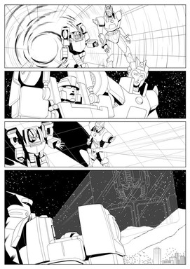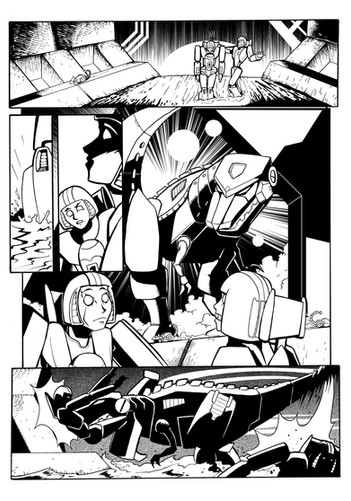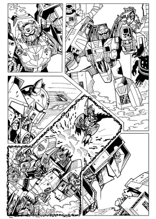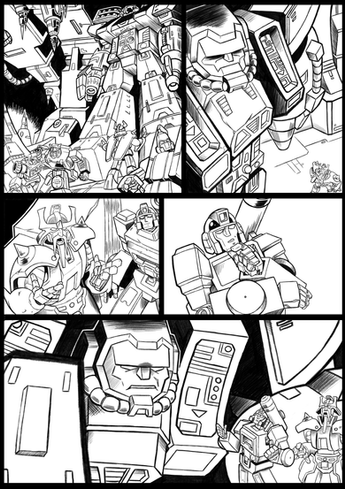 Inks for page 1 of the infamous BotCon 2008 "Shattered Glass" April Fool's Day comic. The final panel on this page has some background "tech shadow" assist from good friend and co-conspirator Trent Troop.Obviously, the art style is inspired by Derek Yaniger's run on Transformers Generation 2. If I'd had a litlte more time, the linework would have been a little straighter on the corss-hatching, but whaddayagonnado.